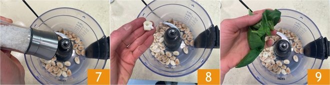 Add the salt 7, the garlic clove peeled and with the germ removed 8, and the fresh basil 9.