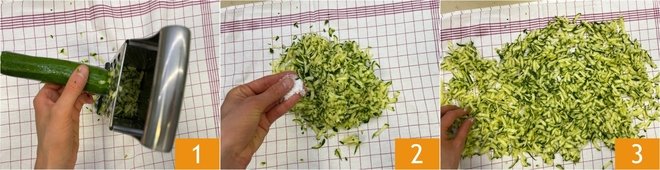 To prepare the zucchini and feta fritters with yogurt sauce, start with the batter: wash and trim the zucchini, then grate them with a large-holed grater 1. Place the zucchini on a dish towel and salt them 2, then let them rest for 15 minutes: this way, they will release some of their water 3. Finally, squeeze them directly inside the dish towel.