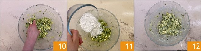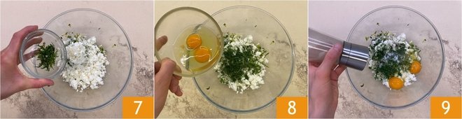 Flavor with chopped mint and parsley 7, then incorporate the eggs 8, salt, and pepper 9.