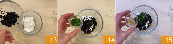 Meanwhile, prepare the sauce: in a bowl, pour the Greek yogurt and chopped pitted black olives 13. Scent with chopped mint and chives 14, then add the honey 15 and lemon juice.