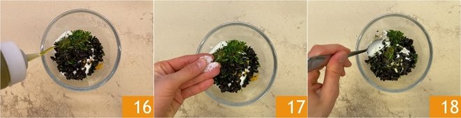 Finish with olive oil 16, salt 17, and pepper, then mix to combine 18. Finally, flavor with grated orange zest.
