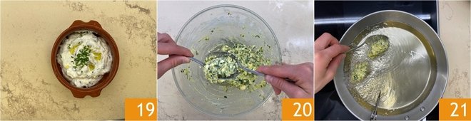 The sauce is ready, set it aside 19. Now heat the seed oil in a high-sided pan until it reaches about 340°F. With two spoons, scoop out small quenelles of batter 20 and immerse them in the hot oil 21.