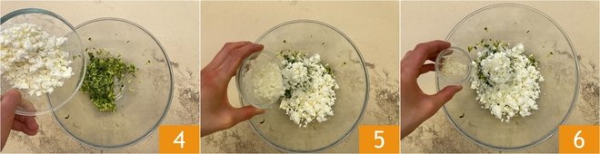 Gather the grated zucchini in a bowl, add the crumbled feta 4, the chopped onion 5, and also the chopped garlic 6.
