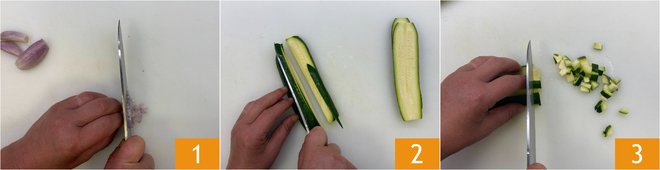 To prepare zucchini and ricotta pasta, first put the water on the stove and bring it to a boil. Meanwhile, finely chop the shallot 1. Cut the zucchini first into slices 2 and then into 1/2 inch cubes 3.