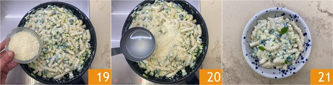 Add the grated Grana Padano cheese 19, a ladle of pasta cooking water 20, stir and plate. Finish with a few basil leaves, and your zucchini and ricotta pasta is ready to be served 21