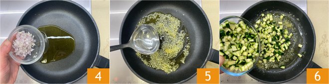In a large pan, pour a drizzle of olive oil, add the shallot 4 and sauté over medium heat. Then add a ladle of water to prevent it from burning 5. Then add the zucchini 6.