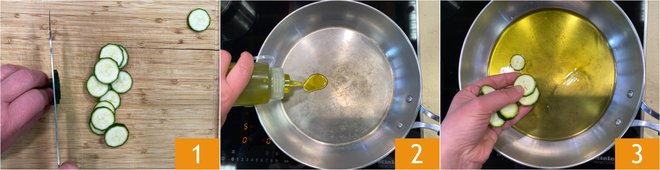 To prepare the zucchini and sausage risotto, first trim the zucchini and slice them into thin rounds 1. Pour plenty of olive oil into a pan 2 and, when it is hot, add one third of the zucchini 3.