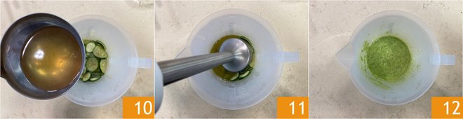 Add a ladle of vegetable broth 10 and blend with an immersion blender 11 to obtain a smooth, homogeneous cream 12. Set aside.