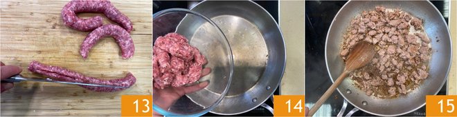 Move on to the sausage: make an incision 13 and remove the casing. Heat the pan in which you cooked the zucchini, add the sausage 14 and brown it over medium heat for a few minutes, breaking it up with a wooden spoon 15. Once cooked and browned, remove from the heat and set aside.