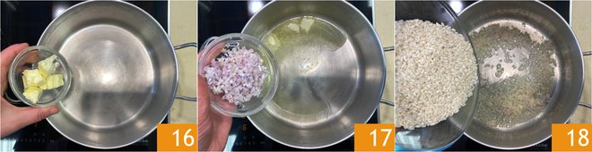 Now dedicate yourself to the risotto: melt the butter in a saucepan 16, then add the finely chopped shallot 17 and let it soften over low heat for a couple of minutes. When it becomes translucent, add the rice 18 and a pinch of salt.
