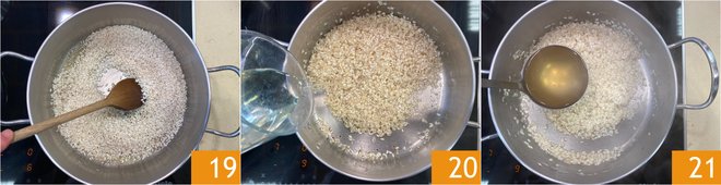 Toast the rice for 1–2 minutes, stirring often 19. Deglaze with the white wine 20 and allow the alcohol to evaporate completely, then cook the rice by adding a ladle of hot broth at a time, making sure the liquid has been absorbed before adding more 21.