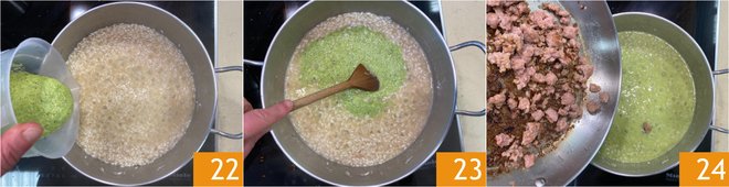 After about 10 minutes, add roughly two thirds of the zucchini cream 22 and stir to evenly coat the rice 23. Also incorporate the sautéed sausage 24 and finish cooking the risotto, which will take about another 5 minutes.