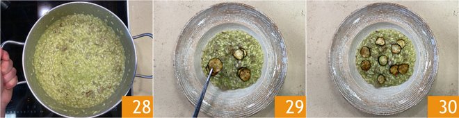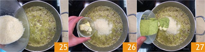 Once ready, turn off the heat and finish by stirring in the grated Parmigiano Reggiano 25, the cold butter 26 and the remaining zucchini cream 27.