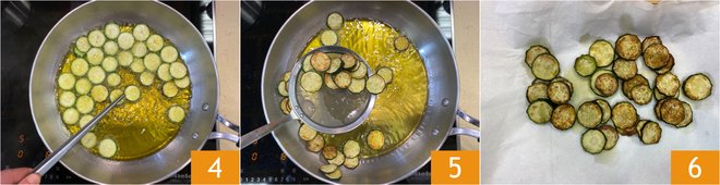 Fry the slices, turning them on both sides 4. Once golden, drain 5 and transfer to paper towels 6. Set aside.