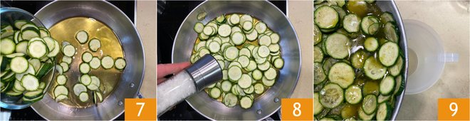 In the same pan add the remaining zucchini 7, season with salt 8 and cook over medium heat for about 10 minutes. When they have softened, transfer the zucchini to a measuring jug 9.
