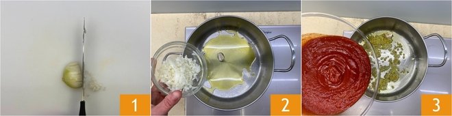 To prepare the zucchini flower parmigiana, start with the sauce: clean and slice the onion 1. In a saucepan, heat a drizzle of oil, add the onion 2, and sauté over low heat. Once the onion has softened, pour in the tomato purée 3.