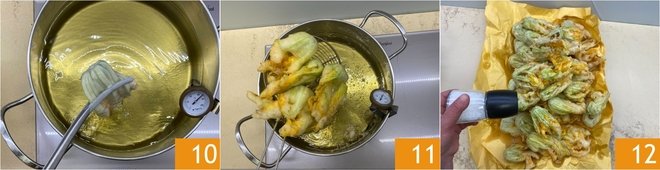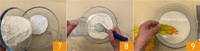 Prepare the batter: in a bowl, pour the two flours 7, slowly add the sparkling water 8 while mixing with a whisk until you obtain a smooth, lump-free mixture. Heat the seed oil in a saucepan, once it reaches the frying temperature of 340°F, first dip the flowers in the batter 9.