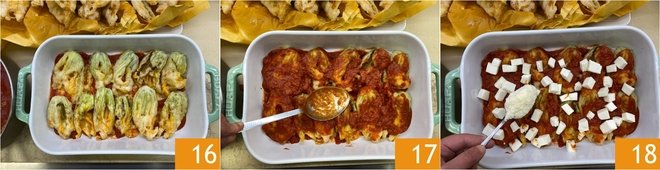 Lay 1/3 of the well-compacted fried zucchini flowers 16. Cover with tomato sauce 17, mozzarella, a sprinkle of Parmigiano Reggiano 18, and a few torn basil leaves.