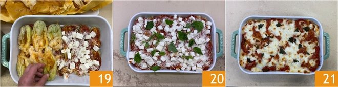 Continue with a second layer 19. Proceed in this way until all the ingredients are used up 20. Bake the zucchini flower parmigiana in a preheated oven at 340°F for 30 minutes or until gratinated 21.
