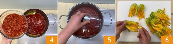 Add the pulp as well 4, salt, pepper, cover with the lid 5, and cook until the sauce has thickened, it will take about 40 minutes. Meanwhile, clean the zucchini flowers 6, removing the stem and pistil.