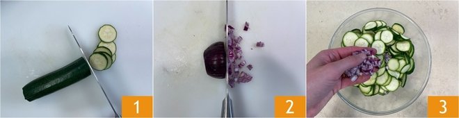 To make the zucchini frittata with provola, first wash the zucchini and trim the ends. Slice them into rounds not too thin 1 and transfer them to a bowl. Finely chop the onion 2 and add it to the zucchini 3.