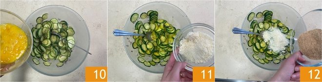 Transfer them to a bowl and add the eggs 10; stir to combine and add the grated cheese 11 and the breadcrumbs 12. Mix well until you obtain a homogeneous mixture.