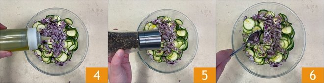 Season with salt, oil 4 and pepper 5, then mix well 6.