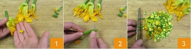 To make the zucchini loaf, first clean the baby zucchinis with the flowers. Remove the inner pistil 1 and detach the flowers, which you will clean with a cloth to remove any soil residue. Detach the zucchinis, trim them 2 and wash under running water. Slice the zucchinis and flowers into rings 3, which once cleaned will weigh about 9 oz.