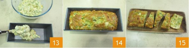 Mix and pour the batter into a loaf pan of 10 x 4.5 inches 13. Bake in a preheated static oven at 350°F for 50 minutes. Once baked, remove the zucchini loaf from the oven 14 and unmold it while still warm. The zucchini loaf is ready to be enjoyed 15.