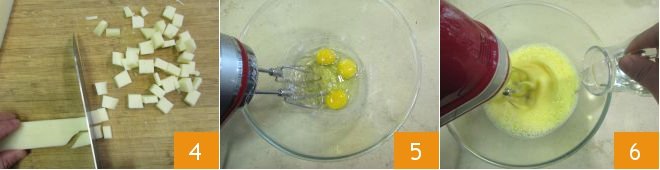 First, cut the spicy provolone into slices and then into cubes 4. Now prepare the batter: in a bowl, pour the eggs and beat them with an electric mixer 5 until they become frothy. Gradually incorporate the seed oil 6 and continue mixing.