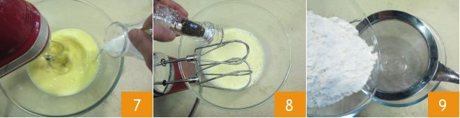 Also pour in the milk 7 and finally add salt and pepper 8. Separately, sift the flour 9 and baking powder.