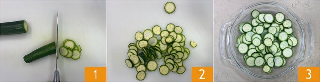To prepare the zucchini omelette in the microwave, first thinly slice the zucchini into rounds about 1/8 inch thick 1 2. Transfer the zucchini to a 20 cm (about 8 inches) round baking dish suitable for microwave cooking 3.