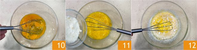 Beat vigorously with a hand whisk or a fork 10, then add the grated Grana Padano DOP 11 and mix one last time 12.