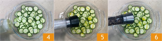 Season with oil 4, salt 5, and pepper 6.