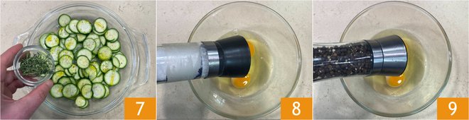 Add the thyme 7 and cook in the microwave at 650 W for 3 minutes. Meanwhile, crack the eggs into a bowl, then season with salt 8 and pepper 9.