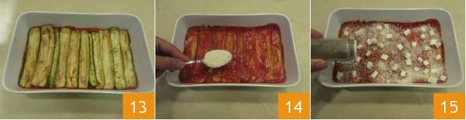 Arrange the zucchini neatly side by side, slightly overlapping 13, covered with a generous layer of tomato sauce, then season with grated parmesan cheese 14, cubes of mozzarella and pepper 15.