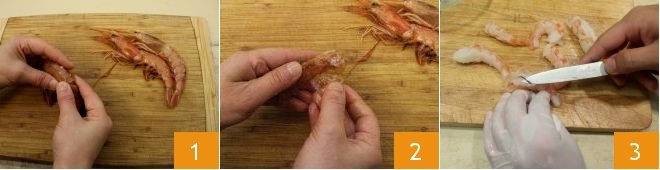 To prepare the Neapolitan mussel soup, start by cleaning the seafood, beginning with the How to clean shrimp, remove the head 1 and tail, then use your fingers to remove the shell 2; make an incision along the back and gently pull out the internal intestine (the black vein) with the tip of a knife 3 (alternatively, you can use a toothpick). Set the shrimp aside and move on to the How to Clean and Open Mussels.