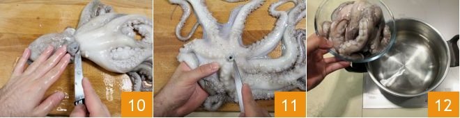 Place it on a cutting board and cut around the eyes to remove them 10; also remove the octopus' beak 11, then tenderize the octopus meat by pounding it with a mallet or meat tenderizer. Rinse the octopus again under cold running water and extract the innards from the sack, then wash it thoroughly inside. Wash and rub the head and tentacles with your hands to remove as much of the coating as possible. Cook it in a pressure cooker for 10 minutes or in a regular pot for 40 minutes 12. Before draining, pierce the meat with the tines of a fork to check that it's the right time to remove it from the heat.