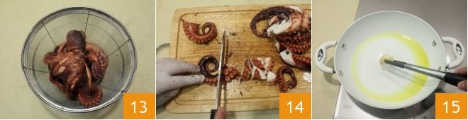 When ready, drain the octopus using a slotted spoon and let it cool 13. Then transfer it to a cutting board and cut the tentacles into pieces 14. Brown a clove of garlic with a drizzle of oil in a non-stick pan 15.