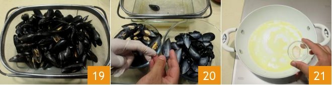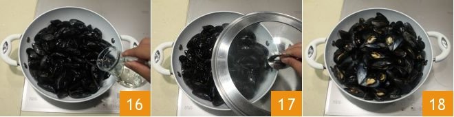When the garlic is well browned, remove it with kitchen tongs and add the mussels; deglaze with white wine 16 and cook covered with a lid 17, letting them open spontaneously 18: it will take about 5 minutes. After this time, check all the mussels: those that have not opened should be discarded.