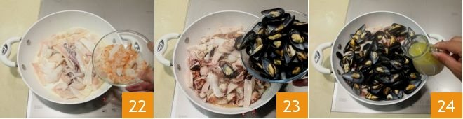 Add the squid, seasoning with salt and pepper to your taste, the shrimp 22, and cook gently for 2 minutes, stirring with a spatula. Then add the octopus and cleaned mussels 23, pouring all the cooking liquid from the latter 24.