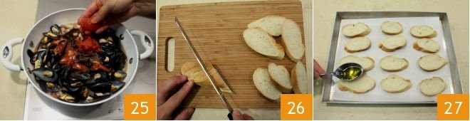 Add the peeled tomatoes 25 and cook for another 10-15 minutes until the sauce thickens. Meanwhile, prepare the croutons: cut the baguette into slices about 1-1/2 inches thick 26, place the slices on a baking tray lined with baking paper, and drizzle each crouton with olive oil 27.