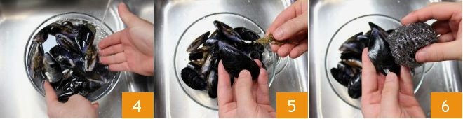 Rinse the mussels under running water 4; then use the back of a knife blade to remove all encrustations and barnacles (parasites that form on the shell) and manually detach the beard (or byssus) protruding from the shells with a sharp motion 5 (to make this easier, you can grip the byssus with a cloth). Still under fresh running water, use a steel wool pad (or a stiff brush) to scrub the mussels vigorously to remove all impurities 6. Once cleaned, set them aside.
