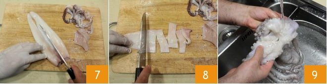 Take the squid and gently separate the head and tentacles from the mantle; wash them well under running water, removing the cartilage pen and ink sac. Cut the squid in half lengthwise 7 and then into strips 8. Proceed with How to Clean and Cook Octopus: rinse it under running water 9, transfer it onto a clean, dry towel, and pat it dry with kitchen paper.