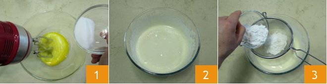 To prepare the zuppa inglese (Italian trifle), start by making the pan di Spagna (sponge cake). Pour the eggs into a bowl at room temperature and beat them with a whisk while adding the sugar a little at a time 1. Continue for about ten minutes or until the mixture becomes clear and frothy: you can also do the "writing" test by lifting a spoonful of the mixture and letting it drip as if you were tracing letters with it 2. Next, place a strainer in the bowl and pour in the flour and potato starch 3.