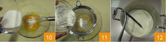 add the sugar, beat quickly and then sift the corn starch 11. By now the milk and cream should be hot, so discard the pod 12