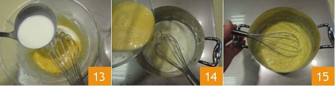 and pour a couple of ladles into the egg mixture to dilute it 13. Then pour into the pan 14 and stir with a whisk while cooking for a few minutes. As soon as the cream thickens, you can turn off the heat 15.