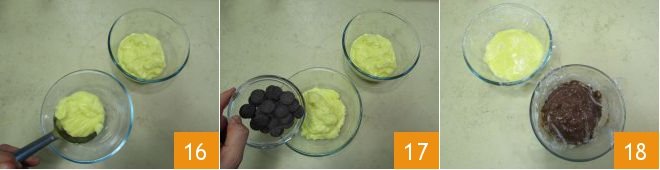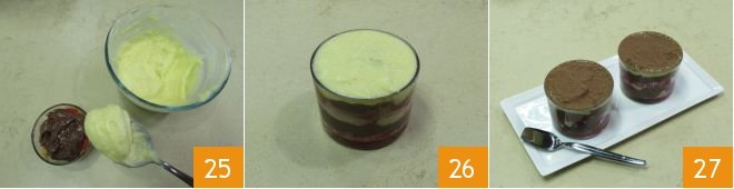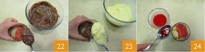 and proceed by pouring a little chocolate cream first 22 and then the vanilla cream 23. Tap the glass to distribute the cream evenly and continue layering with soaked sponge cake 24,
