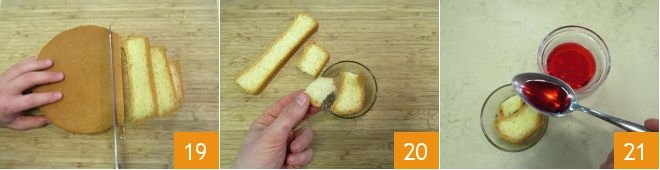 Take the cooled pan di Spagna (sponge cake), use 2 oz (70 g) of it, cut it into vertical slices 1/4-inch (1 cm) thick 19, and trim to fit into 4 glasses of 2/3 cup (150 ml) capacity 20. Soak the sponge cake with alchermes, without exaggerating 21