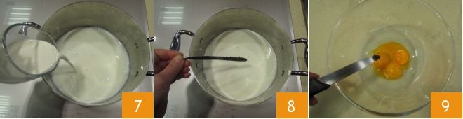 Meanwhile, prepare the pastry cream. Pour the milk and cream into a saucepan 7, scrape the vanilla seeds, keeping them aside, from the pod and place the latter into the saucepan. Let it warm up to just under the boiling point 8. In the meantime, pour the vanilla seeds on the yolks 9,